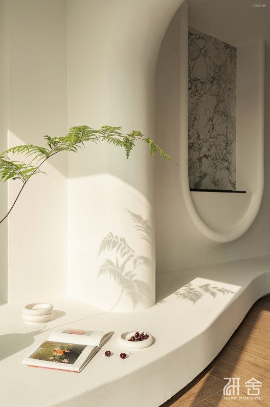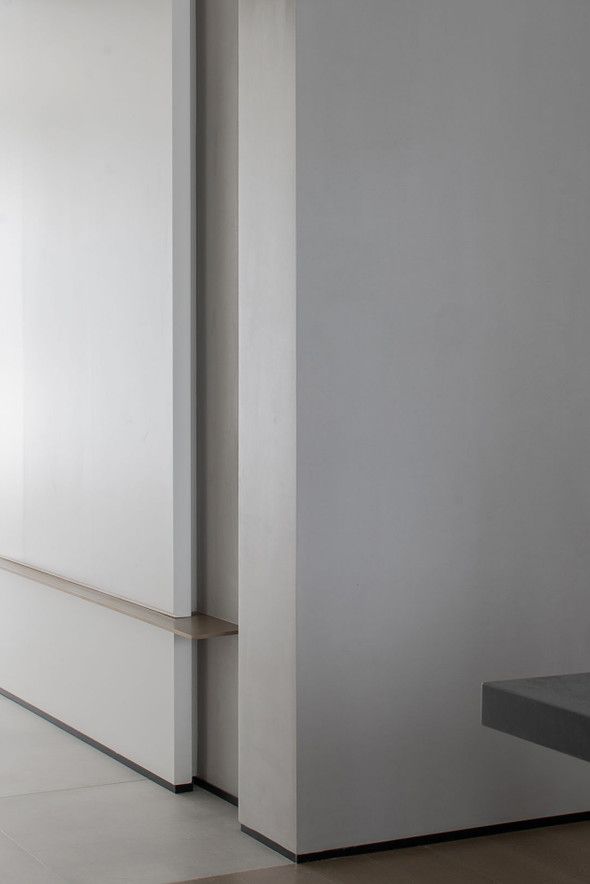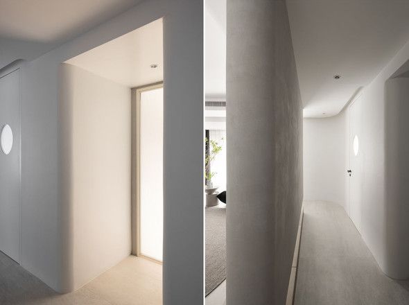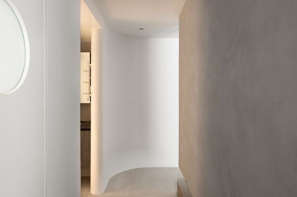 圖/東己壤設(shè)計(jì)研究室 走廊隱藏式踢腳線和弧形墻角的工藝,妥帖的處理了墻面與地面的交互。界面轉(zhuǎn)折的連貫性,讓有限的空間產(chǎn)生無限的尺度。