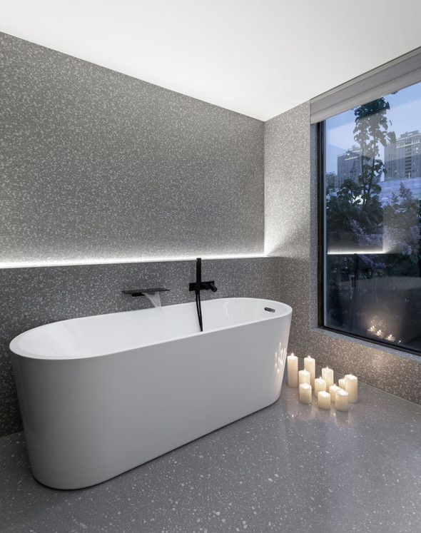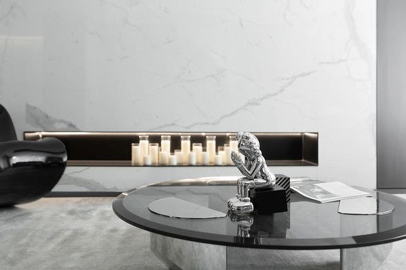 圖/研舍設(shè)計(jì) 比如以下這套90后姑娘的房子,設(shè)計(jì)師將奢華進(jìn)行了精致的提取,同時(shí)保證了她的生活的極致舒適。 客廳舍棄了屋主不常用的電視,留下來是一大片自然的紋理,漂亮的理石紋路連貫并富有張力,下方的壁龕擺放的微光蠟燭,成為溫馨的一筆。