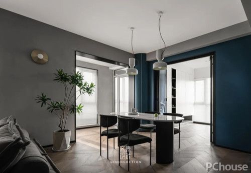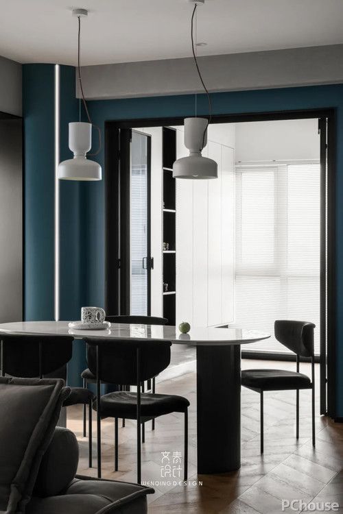 餐 廳 餐廳區(qū)域采用了深色的家具搭配粗曠的藝術(shù)涂料,以及厚重的湖藍(lán)色背景,這種質(zhì)感與色彩的碰撞,給人舒服又特別的味道,完全就是一場(chǎng)視覺(jué)盛宴。
