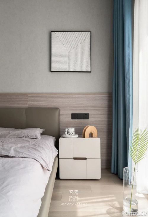 主 臥 主臥的整體感覺(jué)清新淡雅,克制的用色方案,在美化空間的同時(shí),也不會(huì)讓人忽略掉材質(zhì)本身的質(zhì)感。而背景交織的線條,更加營(yíng)造出了美妙的立體感。