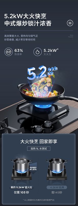 美的二代防干燒燃?xì)庠頠519S-M具備智能定時(shí)功能,能夠根據(jù)不同烹飪方式設(shè)定響應(yīng)時(shí)間,0-99min范圍內(nèi)隨心定時(shí),讓爸媽烹飪時(shí),無(wú)需時(shí)刻守候在灶前,定時(shí)后即使在客廳看電視,也不擔(dān)心鍋里煲湯情況,讓火候與鮮度剛剛好,下廚更省心。 5.2KW大火力,高效烹飪更節(jié)能 對(duì)于習(xí)慣吃中餐的父母來(lái)說(shuō),煎炒烹煮極其講究“火候“,在”旺火“爆炒下,更能鎖住食材鮮美口感,而傳統(tǒng)灶具,往往無(wú)法做到精準(zhǔn)控溫,而讓廚藝大打折扣。