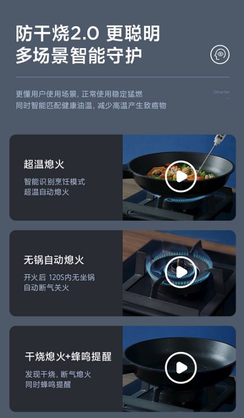 升級(jí)防干燒2.0,全方位守護(hù)爸媽烹飪安全 日常烹飪生活中,很多人難免因?yàn)橛惺码x開(kāi)廚房一會(huì),而忘記關(guān)燃?xì)庠?,出現(xiàn)燒干鍋、燒糊鍋的情形。比如我們的父母日漸年邁,記憶力逐漸衰退,可能僅僅是接個(gè)電話(huà)的功夫,就忘記了鍋里的飯菜,經(jīng)常性忘記關(guān)灶具,會(huì)帶來(lái)很大的火災(zāi)隱患風(fēng)險(xiǎn)。據(jù)統(tǒng)計(jì)近年來(lái),我國(guó)共發(fā)生居住場(chǎng)所火宅132.4萬(wàn)起,其中電氣火災(zāi)占42.7%,傷亡群體中60歲以上的占43.4%,爸媽就是處于這樣的年齡段,因此,廚房安全不容忽視。