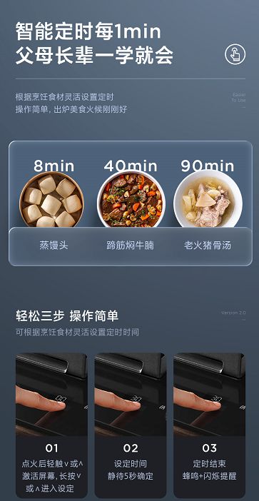 此外,它還支持多場(chǎng)景智能識(shí)別烹飪模式,在超高溫度下會(huì)自動(dòng)熄火;開(kāi)火后,120S內(nèi)無(wú)坐鍋,會(huì)自動(dòng)斷氣關(guān)火;發(fā)現(xiàn)干燒情況,會(huì)立即斷氣熄火,同時(shí)會(huì)蜂鳴提醒用戶(hù),讓爸媽輕松下廚,無(wú)需后顧之憂(yōu)。 智能定時(shí),輕松下廚更省心 傳統(tǒng)烹飪,我們需要寸步不離的在灶具前盯著菜肴、火候,不僅浪費(fèi)時(shí)間,而且需要及時(shí)調(diào)節(jié)火候,操作也比較繁瑣。