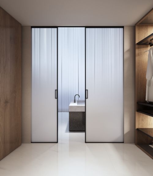 圍繞“自我”所展開的衛(wèi)生間布置,與衣帽間連接起來,打造精致利落、純粹自我的的理想衛(wèi)生間。選擇德立全景門(玻璃隔斷門),隱藏式設計將門“收”進墻內(nèi)。朦朧柔和玻璃帶來通透唯美的視覺體驗。