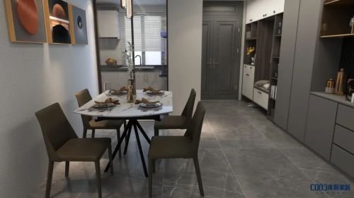 庫斯家居案例-餐廳 餐廳延續(xù)這種風(fēng)格,深灰色的座椅中,奢華正暗流涌動(dòng),隨時(shí)呼之欲出。同時(shí),伸縮式餐桌為主人提供流暢的用餐場(chǎng)景,為生活帶來更多便利。