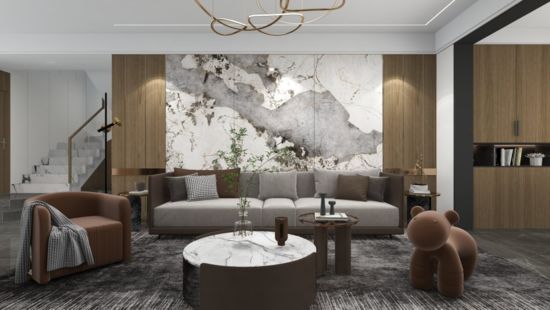 沙發(fā)背景墻運用奧華石晶壁畫、黃栗柚搭配。在看似自然樸素的外表下隱藏著貴族的氣質(zhì)。