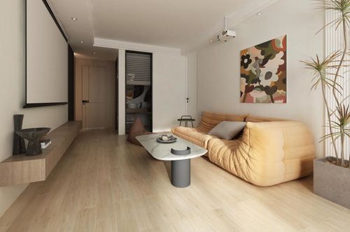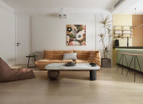 客廳 客廳通鋪木紋磚,彰顯出整體簡約、干凈的基調(diào),營造視覺延伸感。橙黃色的沙發(fā)和個性的掛畫,既與地面的木紋磚形成了統(tǒng)一,又以高飽和度的色彩為空間增添活力和生機。摒棄了傳統(tǒng)的電視背景墻設(shè)計,采用投影儀打造家庭影音室,足不出戶就可以享受到影院般的觀影體驗,成為高品質(zhì)生活的標志。
