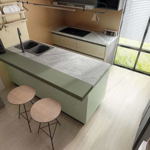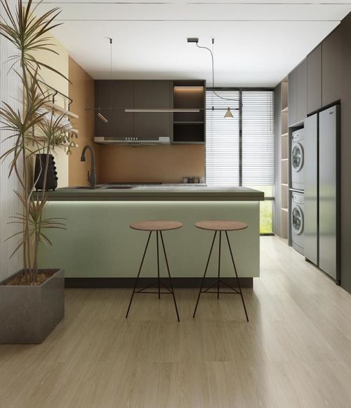 餐廚 餐廚一體化的設(shè)計,靈活運用高性能巖板為島臺與餐桌,實用性強,提高空間利用率。暖色調(diào)的木紋磚與綠色島臺、黃色墻面相互搭配,層次遞進的色彩質(zhì)感為空間帶來了更多藝術(shù)感,體現(xiàn)了餐廚區(qū)域的優(yōu)雅與精致,恰到好處地展現(xiàn)家的溫馨和舒適。