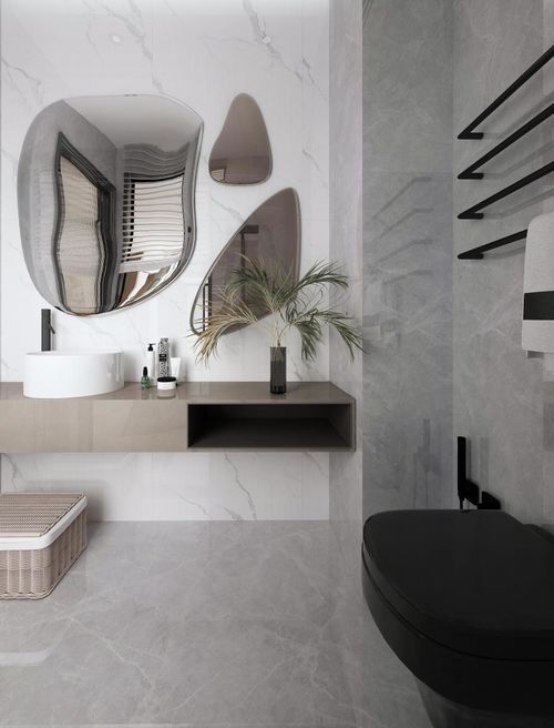 衛(wèi)浴 衛(wèi)生間采用深淺不一的灰色瓷磚,搭配原木色的洗漱桌和造型別致的鏡子,符合整體空間格調(diào),簡潔大氣又不失品質(zhì)感。以黑色馬桶和黑色金屬元素為點綴,高級又充滿時尚感。