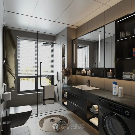 顛覆思維 實(shí)現(xiàn)隱形取暖 奧華天境中央暖空調(diào),推翻既有認(rèn)知和經(jīng)驗(yàn)去追溯吊頂設(shè)計(jì)的初心本源,在取暖器的功率、換氣量等基礎(chǔ)功能上,更強(qiáng)調(diào)電器的裝飾美學(xué)功能。設(shè)計(jì)語(yǔ)言上發(fā)揮顛覆性思維,改變?nèi)∨鞯耐庑?,配合無(wú)邊框大尺寸板材,將浴室取暖器融入到頂部空間,真正做到了隱形取暖,不打擾的溫暖。