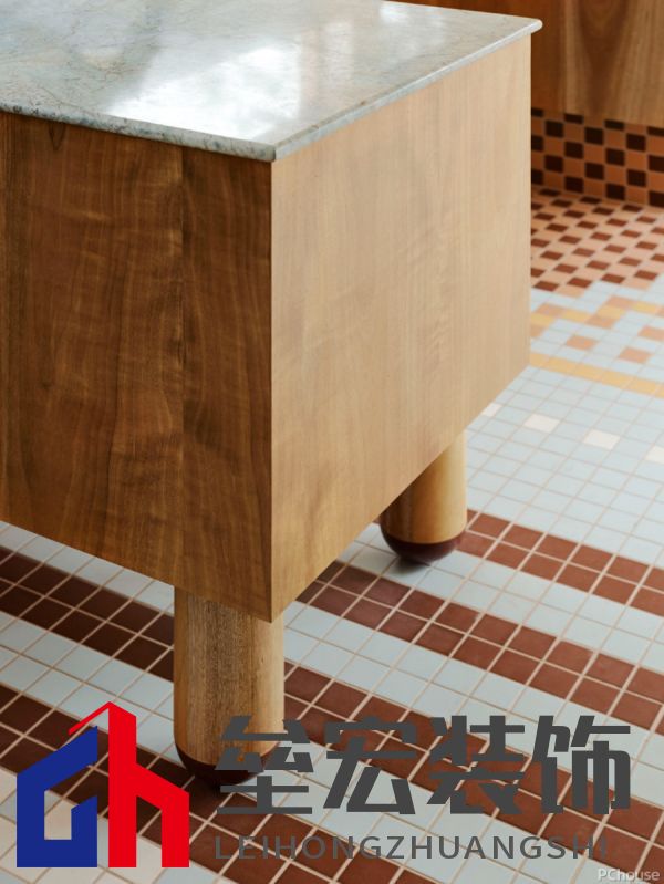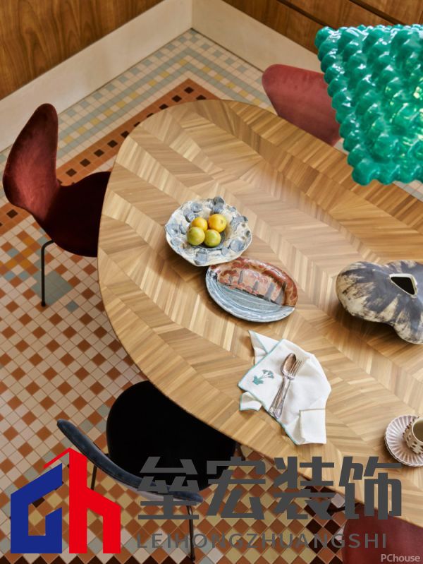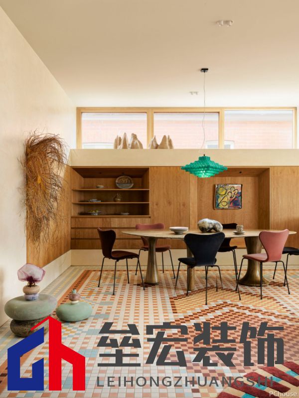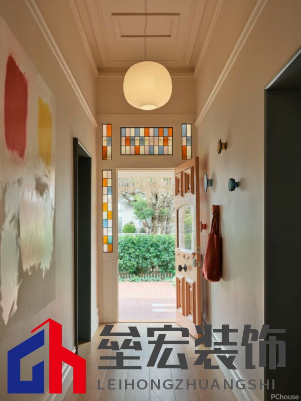玄關(guān)是進(jìn)入住宅的第一印象,也是這所房子風(fēng)格的初步展示。入口處寶石色的鉛燈玻璃成為設(shè)計(jì)中的亮點(diǎn),賦予空間一種濃郁的異國(guó)情調(diào),并且將視覺(jué)線條引向后方擴(kuò)建部分。瓷磚圖案借鑒了波斯地毯的設(shè)計(jì),形成了一塊具有像素化效果的“地毯”,通過(guò)材料和圖案的創(chuàng)新將新舊空間連接起來(lái),同時(shí)預(yù)示著房屋內(nèi)其他區(qū)域豐富的幾何細(xì)節(jié)。
