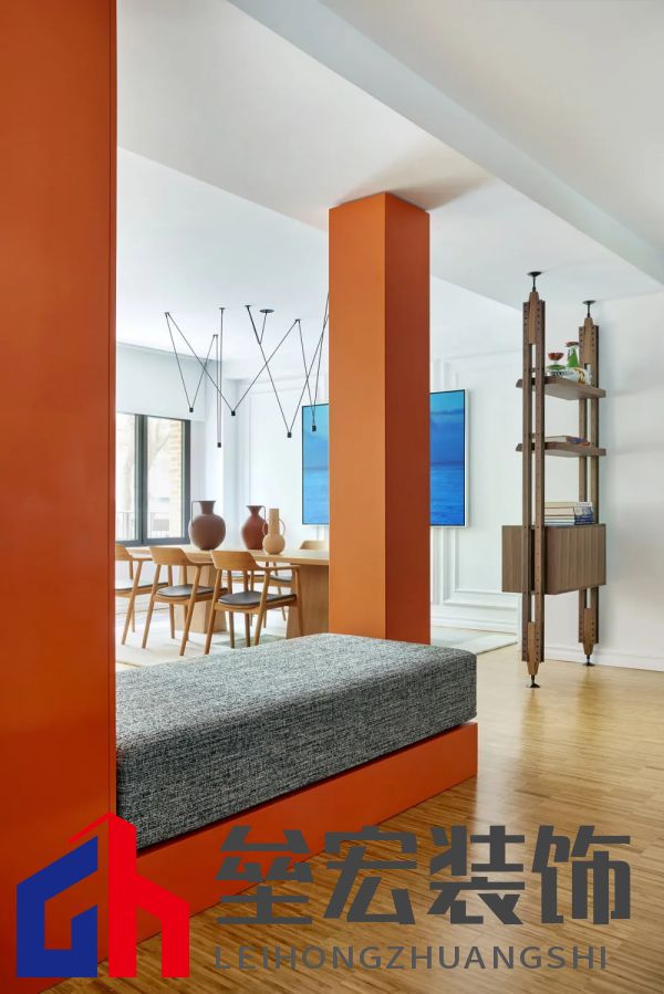 邊界元素。串聯(lián)空間,展現(xiàn)獨(dú)立魅力。設(shè)計(jì)工作室打造的紅色躺椅,以及背景中Cassina的Infinito書架,緊鄰餐廳區(qū)域。Mosso品牌的工業(yè)竹地板提供了中性背景和空間連續(xù)性。