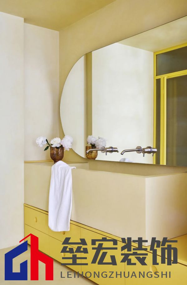 樂觀的空間。黃色的微水泥涂層、支撐在漆器容器和家具上的工藝水槽,或是同色系的隔板,都讓浴室充滿了正能量。弧形鏡子打破了直線條的單一性,增加了活力。