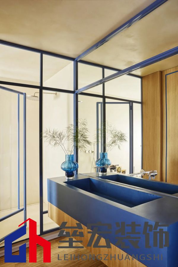 浴室,隔板和低矮的洗臉盆形成鮮明對(duì)比,介于海軍藍(lán)和克萊因藍(lán)之間的藍(lán)色,與條紋木相結(jié)合,帶來優(yōu)雅的“觸感”。