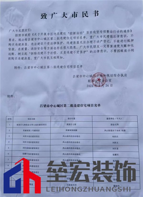 | 2022年4月26日,值山西呂梁違建拆除百日攻堅(jiān)行動(dòng)火熱開(kāi)展之際,呂梁市中心城區(qū)土地和規(guī)劃綜合執(zhí)法聯(lián)席會(huì)議辦公室再次發(fā)布致廣大市民書(shū),書(shū)中就呂梁市中心城區(qū)第二批違建住宅項(xiàng)目名單進(jìn)行了公示,袁家莊七巷趙金元等人違建項(xiàng)目、美麗家園1號(hào)樓項(xiàng)目、劉世兵違法建設(shè)項(xiàng)目等11個(gè)違建項(xiàng)目赫然在列。 繼4月份百日攻堅(jiān)整治行動(dòng)以來(lái),第一批違建項(xiàng)目已在陸續(xù)拆除中,此次,第二批名單的公布再次表明了呂梁市人民政府對(duì)違建拆除的“零容忍“,其可持續(xù)的長(zhǎng)效機(jī)制,彰顯了呂梁市對(duì)拆除違建的信心和決心。