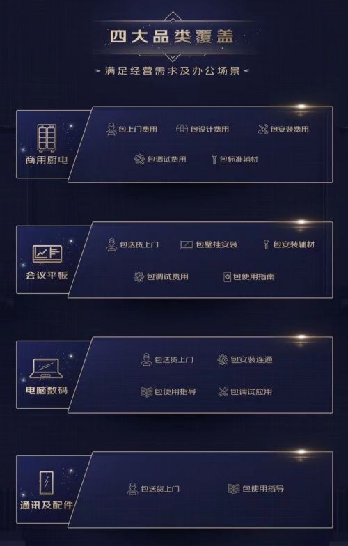 升級(jí)后的方案在原有商用廚電、會(huì)議平板兩大品類的基礎(chǔ)上,新增電腦數(shù)碼、通訊及配件品類,精準(zhǔn)滿足企業(yè)經(jīng)營(yíng)以及辦公場(chǎng)景需要;讓企業(yè)在采購(gòu)商用3C家電產(chǎn)品時(shí),無(wú)需二次支付費(fèi)用,即可享有“包勘測(cè)”、“包安裝”、“包設(shè)計(jì)”、“包輔材”在內(nèi)的一整套工程采購(gòu)服務(wù)權(quán)益,并且每一步都嚴(yán)格依照企業(yè)采購(gòu)需求,由專業(yè)人員全程把關(guān),工程交付體驗(yàn)省心、省時(shí)、省力、高效便捷。