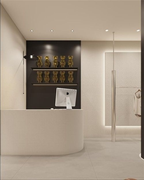 重置室內(nèi)設(shè)計(jì),窺見浪漫色彩,利用藝術(shù)涂料打造自然風(fēng)格,溫柔低調(diào)的米色,透露出隱隱高 級質(zhì)感,喚醒沉睡的藝術(shù)感官,讓顧客享受著購物所帶來的愉悅感的同時,開啟一場服裝與藝術(shù)的對話。 收銀臺同樣落落大方,圓弧線條,給空間增添一抹柔和美感,金屬元素的運(yùn)用更顯精致,在現(xiàn)代主義的濾鏡下,極簡以新形態(tài)呈現(xiàn),有限的空間營造出舒適休閑的氛圍。