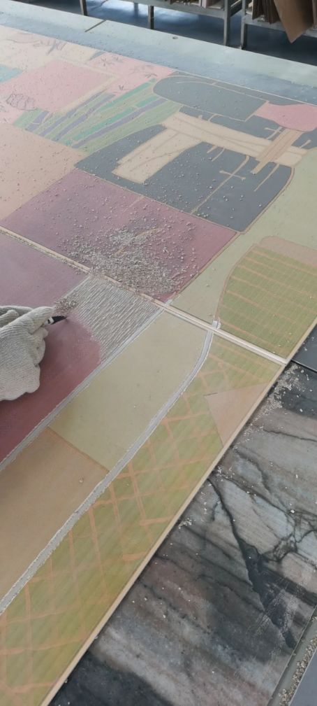 ??精益求精 于細節(jié)處顯匠心 ??要在地鐵站中應(yīng)用文化陶瓷,既需要滿足施工時對于安全的性能要求,也要滿足能夠完美重現(xiàn)作品的藝術(shù)表現(xiàn)力。 ??為此,馬可波羅文化陶瓷特別定制了一款600×1200mm 的黃色面釉磚作為作品平面的底色,既符合原作的色系,又豐富了顏色的層次,讓作品既有平面釉色,又有雕刻后繪制的其他顏色。