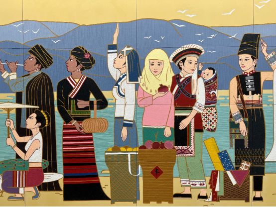 ??本幅作品色彩豐富,原稿針對主畫面人物身上穿著的各式民族服飾使用了不同的色塊進行區(qū)分,而在馬可波羅文化陶瓷上,工藝師加上了不同的刀法來展示,讓作品層次更加豐富。背景中的海鷗,還采用了陰陽刻相結(jié)合的手法,近距離觀看藝術(shù)壁畫的細節(jié),更能感受到手工雕刻精細而傳神的魅力。