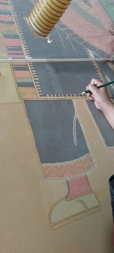 ??作品生產(chǎn)過程中,因原稿尺寸較小,放大后還要對一些細節(jié)進行再次深化。工藝師們用鉛筆在磚坯上二次創(chuàng)作,豐富內(nèi)容,然后進行雕刻,保障作品的藝術(shù)表現(xiàn)力。