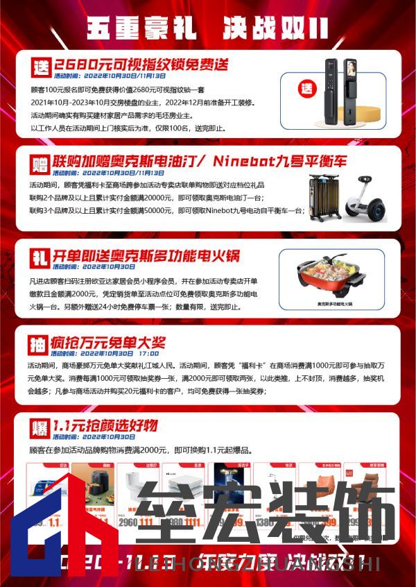 雙十一用實(shí)惠的價(jià)格和高品質(zhì)家居助力每一個(gè)消費(fèi)者完成家居計(jì)劃,展現(xiàn)出歐亞達(dá)光谷商場及各大品牌活力,并聯(lián)合裝修工長、知名設(shè)計(jì)師和新浪家居媒體資源,共同為消費(fèi)者謀福利,一年一次,值得擁有! 歐亞達(dá)光谷商場福利大放送??