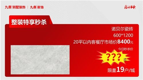 諾貝爾瓷磚,600*1200,20平方以內(nèi)客餐廳市場價(jià)8400元,今日秒殺價(jià)???元(限量19戶/城)