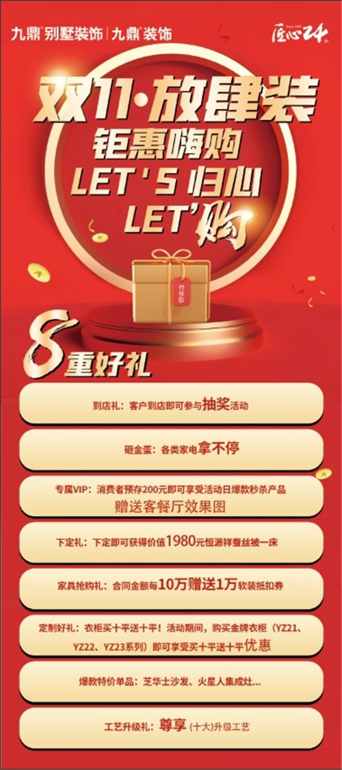 | 前言:安徽蕪湖九鼎裝飾、江蘇連云港九鼎裝飾、河北邯鄲九鼎裝飾、山東青島九鼎裝飾、浙江義烏九鼎裝飾、寧夏銀川九鼎裝飾、山東日照九鼎裝飾......等全國百余家分公司進(jìn)行全國聯(lián)動(dòng),迎戰(zhàn)雙十一。 雙十一,某寶、某東、某多......劍拔弩張,大戰(zhàn)一觸即發(fā),打折、讓利、滿減、送券、直減!聰明的你,也似乎快要被滿屏的“便宜”沖昏頭腦.... 九鼎裝飾讓你跳出真香定律,拒絕套路,不用“剁手”,讓新家裝修變得更簡單!雙十一鉅惠力誠秒爆電商,真正雙十一的優(yōu)惠力度,不需要你動(dòng)腦算了又算,各大家裝品牌直接給你活動(dòng)價(jià),與其他電商產(chǎn)品對比不在怕!讓裝修人不當(dāng)小韭菜,為您置家之路省省省! “雙11.放肆裝”百城聯(lián)動(dòng),千萬補(bǔ)貼, 九鼎裝飾雙11鉅惠活動(dòng)來啦 11月1日至11月11日 九鼎裝飾百城聯(lián)動(dòng)各城市公司 備足多重豪禮 整裝特享、家具搶購禮爆款特價(jià)單品、定制好禮、工藝升級禮…… 期待各位光臨