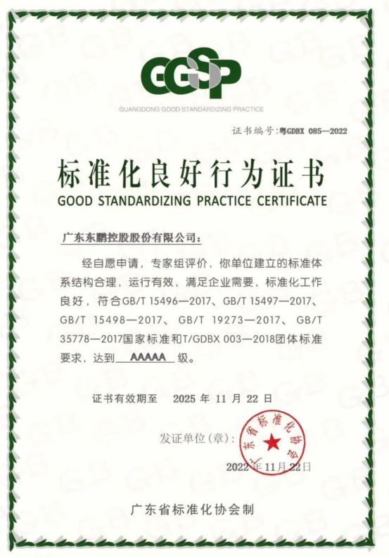 | ??11月22日,廣東省標(biāo)準(zhǔn)化協(xié)會組織專家組對廣東東鵬控股股份有限公司的企業(yè)標(biāo)準(zhǔn)化工作進(jìn)行評價確認(rèn),依據(jù)評價準(zhǔn)則最終評為“標(biāo)準(zhǔn)化良好行為”AAAAA級企業(yè)。 ??企業(yè)標(biāo)準(zhǔn)化良好行為是指企業(yè)依據(jù)《企業(yè)標(biāo)準(zhǔn)體系》系列國家標(biāo)準(zhǔn)(GB/T 15496—2017、GB/T 15497—2017、GB/T 15498—2017、GB/T 19273—2017、GB/T 35778—2017)和廣東省標(biāo)準(zhǔn)化協(xié)會團(tuán)體標(biāo)準(zhǔn)T/GDBX 003—2018等標(biāo)準(zhǔn)要求,開展企業(yè)標(biāo)準(zhǔn)化工作,建立全新的企業(yè)標(biāo)準(zhǔn)體系并有效運行,保證企業(yè)各項活動有序開展并取得良好經(jīng)濟(jì)和社會效益。