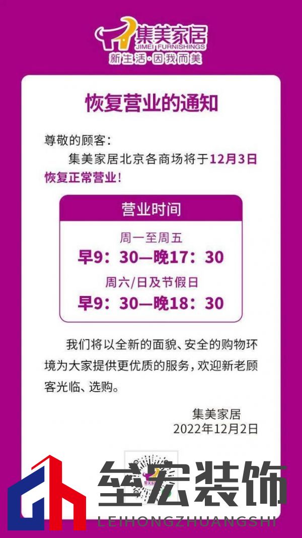 | 近期,北京多家商場(chǎng)陸續(xù)恢復(fù)營(yíng)業(yè)。12月2日,北京集美家居、城外誠(chéng)家居兩大家居賣(mài)場(chǎng)發(fā)布營(yíng)業(yè)通知。北京城外誠(chéng)家居廣發(fā)通知,城外誠(chéng)商場(chǎng)于12月3日(今日)恢復(fù)正常營(yíng)業(yè),消息顯示,城外誠(chéng)冬季營(yíng)業(yè)時(shí)間為周一至周五9時(shí)30分-17時(shí)30分,周六/日及節(jié)假日為9時(shí)30分-18時(shí)30分;同日集美家居發(fā)布消息稱(chēng),集美家居北京各商場(chǎng)于12月3日恢復(fù)正常營(yíng)業(yè),營(yíng)業(yè)時(shí)間為周一至周五9時(shí)30分-17時(shí)30分,周六/日及節(jié)假日9時(shí)30分-18時(shí)30分。商場(chǎng)提示消費(fèi)者佩戴口罩進(jìn)入商場(chǎng)和停車(chē)場(chǎng),持48小時(shí)核酸綠碼,掃碼測(cè)溫入場(chǎng)。   |