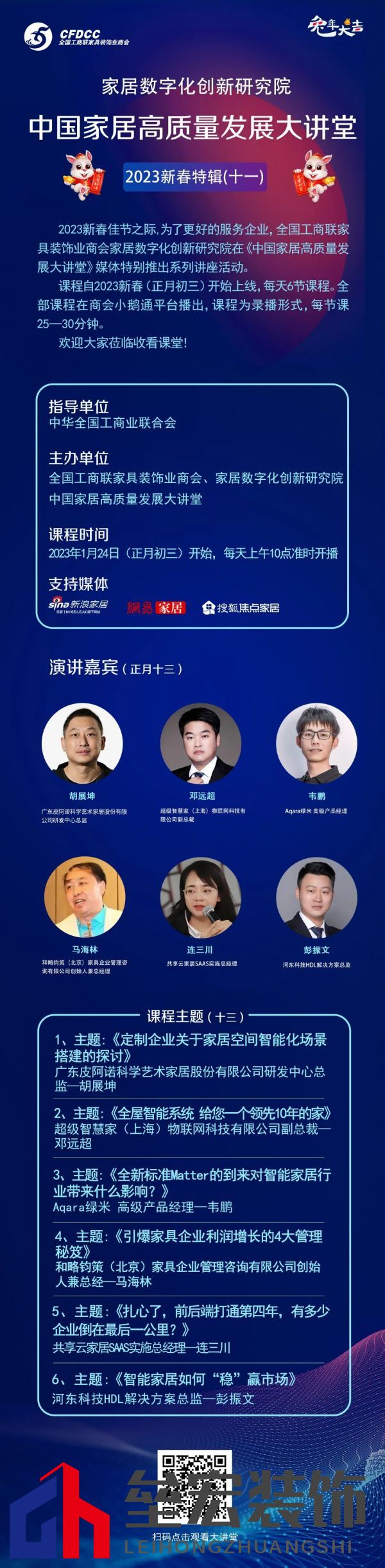 | ??值此新春佳節(jié)之際,由全國工商聯(lián)家具裝飾業(yè)商會家居數(shù)字化創(chuàng)新研究院主辦的2023“中國家居高質量發(fā)展大講堂”于正月初三上午10點正式上線播出!《中國家居高質量發(fā)展大講堂》自2022年春節(jié)推出以來,深受行業(yè)的好評,最多時一場十幾萬人在線收看。 ??今年的大講堂課程設計,密切結合家居行業(yè)實際,選擇行業(yè)亟待解決的、重點關注的、對行業(yè)發(fā)展具有深刻影響的內容,特別邀請行業(yè)專家授課,包括了四大熱點主題:數(shù)字化轉型案例分享、元宇宙技術與應用、家居整裝與供應鏈、智能家居技術講座。 ??正月十三的演講主題如下圖,歡迎大家掃描二維碼收看課堂!
