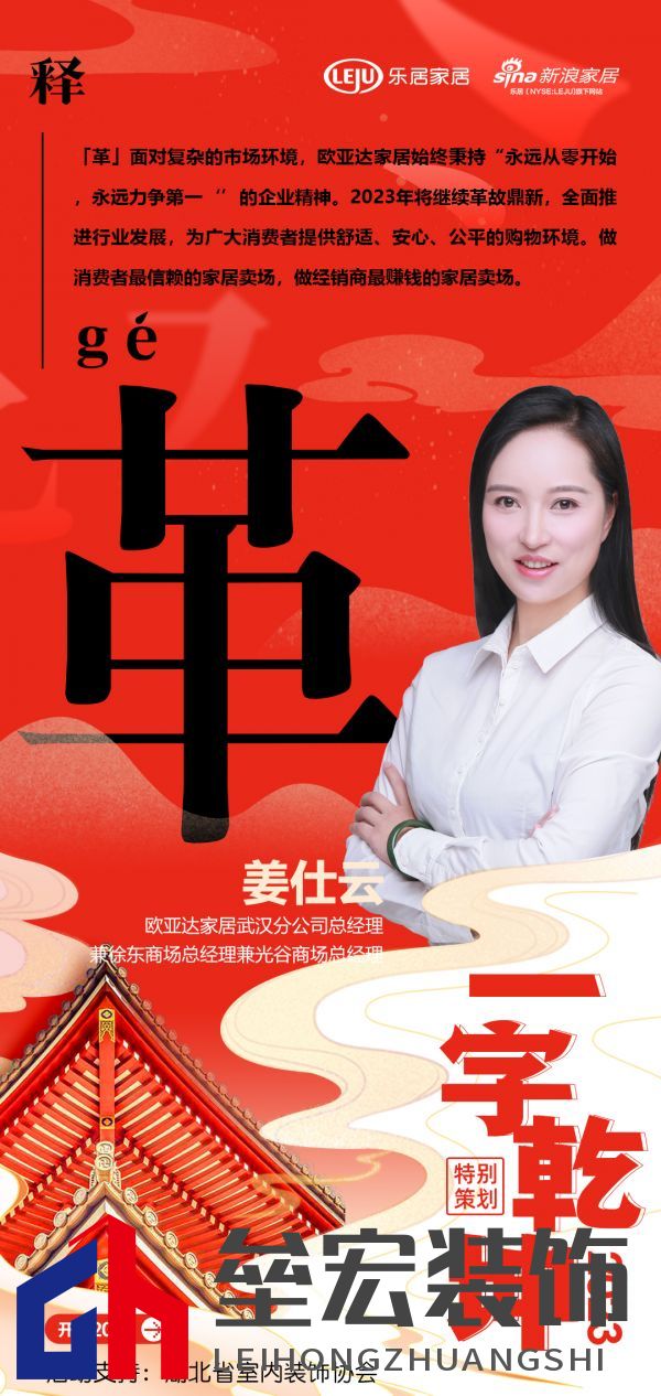 在新浪家居“2023一字乾坤”活動中,歐亞達家居武漢分公司總經(jīng)理兼徐東商場總經(jīng)理兼光谷商場總經(jīng)理姜仕云:「革」去故也。鼎,取新也。面對復(fù)雜的市場環(huán)境,歐亞達家居始終秉持“永遠從零開始,永遠力爭第一”的企業(yè)精神。2023年將繼續(xù)革故鼎新,全面推進行業(yè)發(fā)展,為廣大消費者提供舒適、安心、公平的購物環(huán)境。做消費者最信賴的家居賣場,做經(jīng)銷商最賺錢的家居賣場。