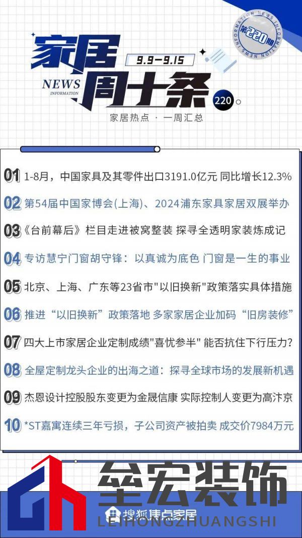 |  01 1-8月,中國家具 出口3191.0億元 同比增長12.3% 據(jù)海關(guān)總署9月10日發(fā)布的數(shù)據(jù),2024年8月,我國家具及其零件出口額為345.3億元,去年8月出口額為363.0億元,同比減少4.9%。 此外,1至8月,家具及其零件出口額為3,191.0億元,去年同期為2,841.8億元,同比增長12.3%;陶瓷產(chǎn)品出口額為1,021.2億元,去年同期為1,168.9億元,同比下降12.6%。 02 第54屆中國家博會(上海) 2024浦東家具家居雙展舉辦 9月11日,第54屆中國家博會(上海)于上海虹橋·國家會展中心盛大開幕。作為中國對外貿(mào)易中心集團(tuán)旗下品牌旗艦展會,中國家博會(上海)以“設(shè)計賦能,內(nèi)外雙驅(qū)”為主題,致力打造中國家居商業(yè)設(shè)計第一展。  本屆展覽規(guī)模達(dá)30萬平方米,匯聚顧家、悍高、泰普森、M&D、LAZBOY樂至寶、夢百合、絲漣、HC28|都匯里、幾間等超1300家參展企業(yè)。  9月13日15時,第二十九屆中國國際家具展覽會中國家具高端制造展FMC China 20242024摩登上海時尚家居展(簡稱“2024浦東家具家居雙展”)在上海新國際博覽中心和世博展覽館圓滿閉幕。  最新數(shù)據(jù)顯示:2024年浦東家具家居雙展參觀共計167,205 人次。其中海外28,644人次,在去年5天變成今年4天展期的情況下,仍實現(xiàn)了同比去年增長11.9%!新展商占比超過1/3達(dá)到1010家,10年以上參展商488家,共同推動行業(yè)革新與可持續(xù)發(fā)展。  03 臺前幕后|第二季 第2期 探尋“不怕踩雷的全透明家裝” 搜狐焦點家居攜手保利管道,帶來關(guān)于家裝的幕后故事,并聯(lián)手打造《臺前幕后》欄目,致敬家裝領(lǐng)域幕后英雄。本期臺前幕后就帶大家揭秘一家真正能做到“透明每一步”的整裝公司——被窩整裝。  被窩整裝注重裝修的透明與品質(zhì),更重視每一位業(yè)主的滿意度,“十心實意安信服務(wù)”,被窩兜底,說到做到!具體而言,報價透明,告別惡意增項;材料正品,從廠到家實時追蹤;施工透明,360°無死角監(jiān)控;匠心獨運,細(xì)節(jié)決定品質(zhì)。 04 慧寧門窗董事長胡守鋒: 真誠為人生底色,聚焦門窗成就一生事業(yè) 搜狐焦點家居特別策劃欄目《掌門人》 ,對話慧寧門窗董事長胡守鋒先生,聽他分享從零開始的創(chuàng)業(yè)歷程與企業(yè)未來愿景,并深度剖析行業(yè)發(fā)展趨勢與市場洞察,揭示慧寧門窗如何在激烈的市場競爭中憑借獨特的策略和穩(wěn)健的步伐脫穎而出。 胡守鋒表示:“未來能夠在行業(yè)中生存和發(fā)展的企業(yè)必定是誠信經(jīng)營、具有良心的企業(yè)。市場的淘汰賽已開始,企業(yè)必須穩(wěn)扎穩(wěn)打,不斷提升自身的綜合能力?!?/p>  自創(chuàng)立以來,慧寧門窗始終秉持“一厘米寬,一萬米深”的發(fā)展理念,以高標(biāo)準(zhǔn)要求自己,致力于為消費者提供智能、節(jié)能、安全的高性能系統(tǒng)門窗產(chǎn)品。  展望未來,胡守鋒堅信,慧寧門窗將在行業(yè)責(zé)任感和持續(xù)創(chuàng)新的驅(qū)動下,繼續(xù)引領(lǐng)行業(yè)發(fā)展,邁向更加輝煌的明天。正是這種堅定的信念和持續(xù)的努力,慧寧門窗將在未來的發(fā)展中書寫新的輝煌篇章。 05 23省市“以舊換新”政策落實具體措施 涉智能馬桶、淋浴房、花灑... 今年三月,國務(wù)院發(fā)布了《推動大規(guī)模設(shè)備更新和消費品以舊換新行動方案》以來,“以舊換新”政策收到廣大行業(yè)人士的關(guān)注,聚焦在相關(guān)補貼政策如何落地。目前,隨著“以舊換新”政策的逐步落實,全國23個包括北京、上海、廣東、福建、湖南、等省市陸續(xù)出臺相關(guān)落地政策。  8月26日 ,北京發(fā)布《積極推進(jìn)家裝以舊換新工作方案》。9月2日,上海市商務(wù)委等六部門關(guān)于印發(fā)《上海市加力支持綠色智能家電家居消費補貼政策》的通知 。此外,廣東聚焦綠色、智能、適老,對消費者購買舊房裝修和廚衛(wèi)等局部改造、居家適老化改造所用物品和材料給予補貼,促進(jìn)智能家居消費。 06 推進(jìn)“以舊換新”政策落地 多家企業(yè)加碼“舊房裝修” 近日,上海印發(fā)《消費品以舊換新工作實施方案》,其中提到,對家居消費按照銷售價格的15%予以補貼。值得注意的是,此次上海市重點提到了針對“舊房裝修改造”開展專屬補貼。  業(yè)內(nèi)人士表示,家裝以舊換新對存量房產(chǎn)的發(fā)展有著重大的推動作用,同時家裝本身就是一個“大家居”概念的產(chǎn)業(yè)鏈,鏈條非常長,也將帶動多產(chǎn)業(yè)鏈發(fā)展。 07 四大上市企業(yè)定制成績喜憂參半 能否抗住下行壓力? 受上游房地產(chǎn)行業(yè)的快速調(diào)整影響,消費信心也尚待進(jìn)一步恢復(fù),包括全屋定制在內(nèi)的家居行業(yè)短期壓力加大。顧家家居、兔寶寶、大亞圣象、華帝股份四大上市公司,近年均在跨界定制業(yè)務(wù)。以2024上半年的營收指標(biāo)看,顧家、圣象同比實現(xiàn)增長,兔寶寶和華帝業(yè)績下滑。 隨著家居消費趨勢的變化,企業(yè)間的競爭由單品轉(zhuǎn)向全屋,日趨白熱化的態(tài)勢有增無減。業(yè)內(nèi)人士分析 提升客單值把流量價值最大化是未來的發(fā)力點,而裝企渠道、海外市場、差異化產(chǎn)品以及電商模式等成為新的增長突破口。 08 全屋定制龍頭企業(yè)的出海之道: 探尋全球市場的新機遇 在“出海”浪潮中,定制