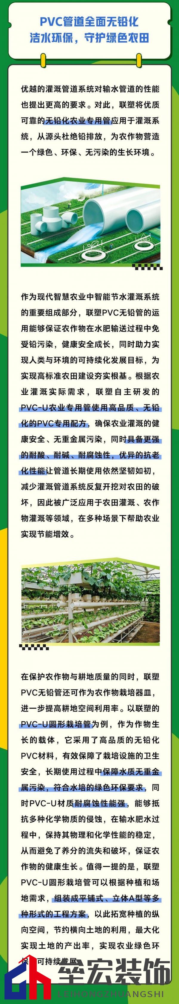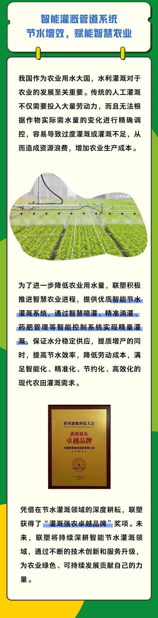 憑借在節(jié)水灌溉領(lǐng)域的深度耕耘,聯(lián)塑獲得了“灌溉強農(nóng)卓越品牌”獎項。未來,聯(lián)塑將持續(xù)深耕智能節(jié)水灌溉領(lǐng)域,通過不斷的技術(shù)創(chuàng)新和服務(wù)升級為農(nóng)業(yè)綠色、可持續(xù)發(fā)展貢獻自己的力量。 潔水環(huán)保,守護綠色農(nóng)田 優(yōu)越的灌溉管道系統(tǒng)對輸水管道的性能也提出更高的要求。對此,聯(lián)塑將優(yōu)質(zhì)可靠的無鉛化農(nóng)業(yè)專用管應(yīng)用于灌溉系統(tǒng),從源頭杜絕鉛排放,為農(nóng)作物營造一個綠色、環(huán)保、無污染的生長環(huán)境。 作為現(xiàn)代智慧農(nóng)業(yè)中智能節(jié)水灌溉系統(tǒng)的重要組成部分,聯(lián)塑PVC無鉛管的運用能夠保證農(nóng)作物在水肥輸送過程中免受鉛污染,健康安全成長,同時助力實現(xiàn)人類與環(huán)境的可持續(xù)化發(fā)展目標,為實現(xiàn)高標準農(nóng)田建設(shè)夯實根基。根據(jù)農(nóng)業(yè)灌溉實際需求,聯(lián)塑自主研發(fā)的PVC-U農(nóng)業(yè)專用管使用高品質(zhì)、無鉛化的PVC專用配方,確保農(nóng)業(yè)灌溉的健康安全、無重金屬污染,同時具備更強的耐酸、耐堿、耐腐蝕性,優(yōu)異的抗老化性能讓管道長期使用依然堅韌如初減少灌溉管道系統(tǒng)反復開挖對農(nóng)田的破壞,因此被廣泛應(yīng)用于農(nóng)田灌溉、農(nóng)作物灌溉等領(lǐng)域,在多種場景下幫助農(nóng)業(yè)實現(xiàn)節(jié)能增效。