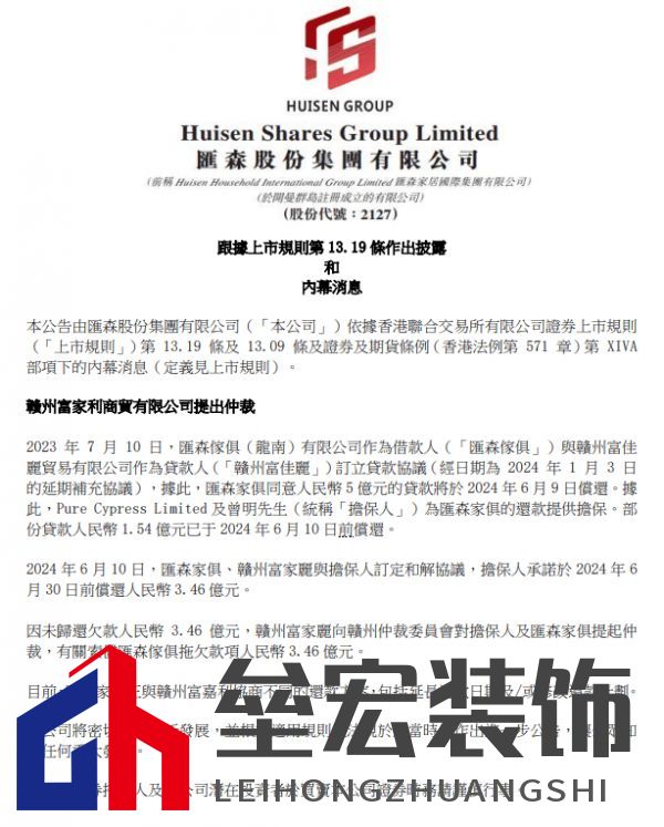 | 匯森股份2月6日公告,因未如期歸還欠款3.46億元,公司已被債權(quán)人申請仲裁。  根據(jù)公告,2023年7月10日,匯森家具(龍南)有限公司作為借款人(「匯森家具」)與贛州富佳麗貿(mào)易有限公司作為貸款人(「贛州富佳麗」)訂立貸款協(xié)議(經(jīng)日期為2024年1月3日的延期補(bǔ)充協(xié)議),據(jù)此,匯森家俱同意人民幣5億元的貸款將于2024年6月9日償還。據(jù)此,Pure Cypress Limited及曾明先生(統(tǒng)稱「擔(dān)保人」)為匯森家俱的還款提供擔(dān)保。部份貸款人民幣1.54億元已于2024年6月10日前償還。 2024年6月10日,匯森家俱、贛州富家麗與擔(dān)保人訂定和解協(xié)議,擔(dān)保人承諾于2024年6月30日前償還人民幣3.46億元。 因未歸還欠款人民幣3.46億元,贛州富家麗向贛州仲裁委員會對擔(dān)保人及匯森家俱提起仲裁,有關(guān)索償匯森家具拖欠款項(xiàng)人民幣3.46億元。 目前,匯森家俱正與贛州富嘉利協(xié)商不同的還款方案,包括延長還款日期及/或修改還款計劃。匯森家俱稱,公司將密切監(jiān)察最新發(fā)展,并根據(jù)適用規(guī)則及法規(guī)于適當(dāng)時候作出進(jìn)一步公告,讓公眾知悉任何重大發(fā)展。 來源:77度 |