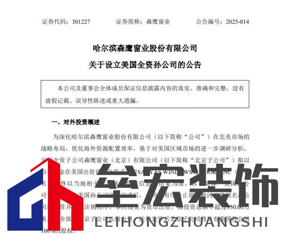 |  2月25日,森鷹窗業(yè)(301227.SZ)發(fā)布公告稱,為深化公司在北美市場的戰(zhàn)略布局,優(yōu)化海外資源配置效率,基于對(duì)美國區(qū)域市場的進(jìn)一步調(diào)研分析,公司全資子公司森鷹窗業(yè)(北京)有限公司(簡稱“北京子公司”)擬以自有資金在美國出資設(shè)立全資子公司SAYYAS WINDOWS & DOORS INC(暫定名,最終以當(dāng)?shù)叵嚓P(guān)部門核準(zhǔn)登記信息的結(jié)果為準(zhǔn),簡稱“美國孫公司”)。 本次美國孫公司注冊(cè)完成后,公司將有序終止原俄勒岡州的同名孫公司的運(yùn)營并申請(qǐng)注銷程序。本次投資為貨幣出資,擬投資總額不超過150.00萬美元,全部由北京子公司認(rèn)繳出資,注冊(cè)完畢后北京子公司將持有美國孫公司100%的股權(quán)。 針對(duì)設(shè)立全資孫公司的目的,森鷹窗業(yè)表示,主要是基于公司對(duì)美國區(qū)域市場的進(jìn)一步調(diào)研分析,對(duì)美國公司架構(gòu)進(jìn)行戰(zhàn)略調(diào)整。本次美國孫公司擬設(shè)立在休斯頓市,休斯頓作為美國第四大城市及重要交通樞紐,建筑相關(guān)企業(yè)聚集,墨西哥灣沿岸區(qū)位優(yōu)勢顯著,在市場基礎(chǔ)、地理位置、物流成本及營商環(huán)境等方面更具綜合性優(yōu)勢,有利于美國孫公司更好的進(jìn)行市場拓展,獲取客戶及合作伙伴,加快本土化運(yùn)營進(jìn)程,進(jìn)而促進(jìn)公司在北美市場的整體戰(zhàn)略布局。 |