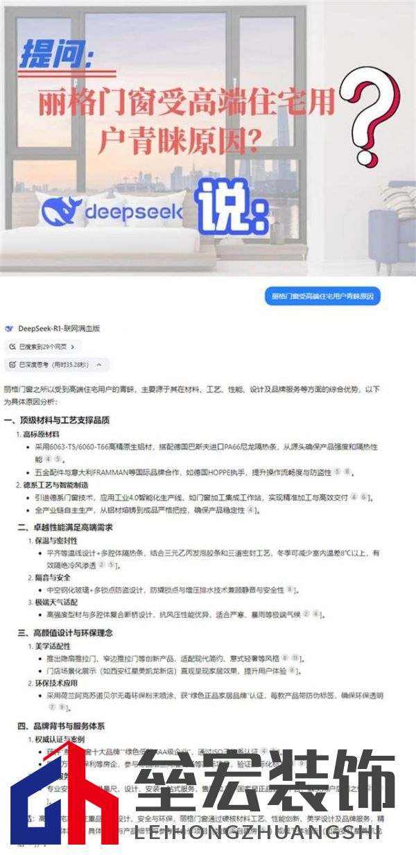??DeepSeek,這位AI界的佼佼者,以其強(qiáng)大的自然語言處理能力和深厚的算法基礎(chǔ),正逐步改變著人們的生活方式。它不僅能夠?yàn)橛脩籼峁┚珳?zhǔn)的信息查詢和高效的輔助學(xué)習(xí),更因其對中國本土語境的深刻理解,成為了無數(shù)人心中的智能伙伴。 ??那么,DeepSeek,這位 AI 領(lǐng)域的佼佼者,會以怎樣的視角審視麗格門窗?又會如何對麗格門窗的獨(dú)特魅力進(jìn)行深度解析?
