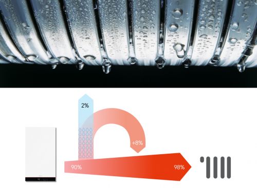 ??初代冷凝爐——冷凝技術(shù) ??「冷凝」技術(shù)可以理解為一種“熱量回收”技術(shù),它能夠?qū)⒏邷責煔庵械臒崃窟M行充分回收利用。 ??比如燒燃天然氣時,高溫煙氣原本會帶著大量熱量直接排走,但冷凝技術(shù)會把這些高溫煙氣強行“降溫”,讓其中的水蒸氣像出汗一樣變成液態(tài)水,同時釋放出大量隱藏的熱量,這些“搶回來”的熱量又被重新利用。運用這個原理,冷凝壁掛爐就能把排放煙氣中的熱量充分回收再用于供熱。