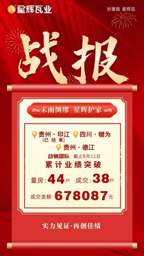 ??截止8月11日,星輝瓦業(yè)貴州印江、貴州德江、四川犍為專賣店在本輪活動(dòng)期間11天狂攬38單,簽單總額突破67萬元,再次取得活動(dòng)的階段性勝利。這場以“服務(wù)力+產(chǎn)品力+品牌力”為內(nèi)核的終端服務(wù)戰(zhàn)役,不僅為各地經(jīng)銷商注入增長強(qiáng)心劑,更是將星輝瓦業(yè)的“品質(zhì)”和“口碑”深植多地用戶心中。 ??活動(dòng)期間,在總部支持下,星輝瓦業(yè)各地專賣店以“產(chǎn)品大促+工廠補(bǔ)貼+惠民好禮”三重促銷組合拳,重磅推出“榮耀三十年—屋面翻修百萬補(bǔ)貼服務(wù)節(jié)”大型終端促銷活動(dòng),并免費(fèi)提供房屋勘測服務(wù),全面讓利終端用戶。